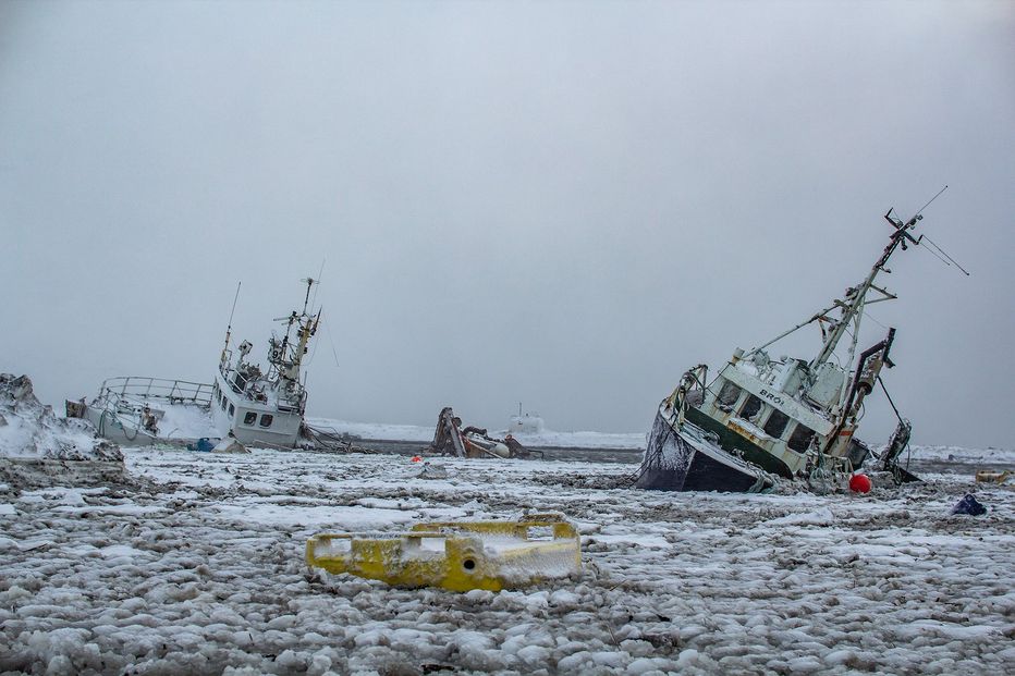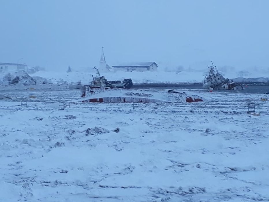 stóri báturinn sem er á hvolfi er dragnótabáturinn Eiður ÍS 126.