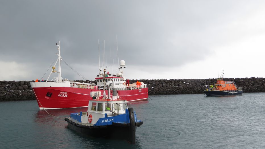 vel gekk að draga bátinn þrátt fyrir nokkra ölduhæð, eftir að Langanes GK kom að bryggju í Njarðvík