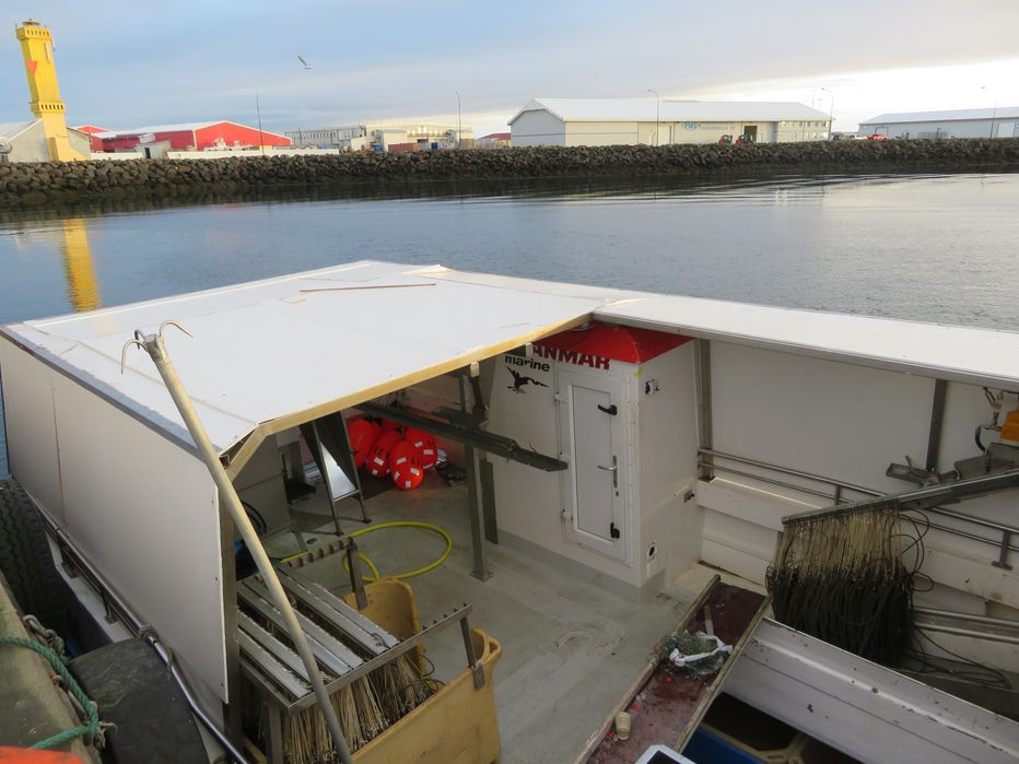 Eins og sést á myndunum þá er búið að byggja yfir bátinn og það gerði Robbi sjálfur eins og er kallaður um borð í bátnum er rekkakerfi, og er stokkað upp í landi,