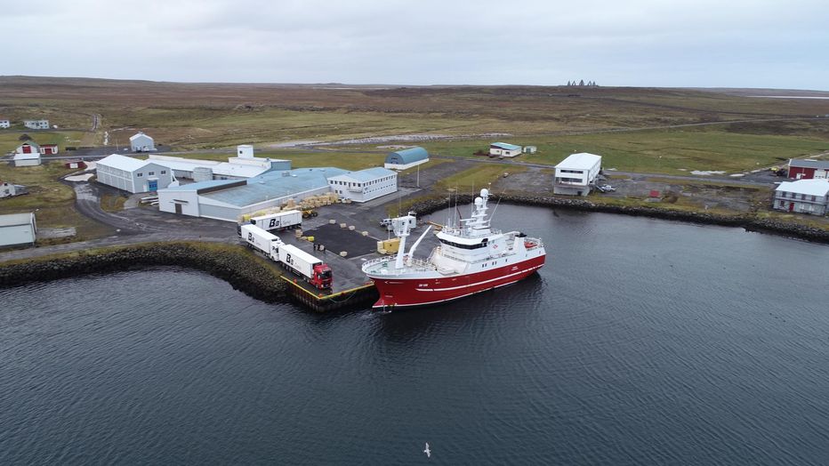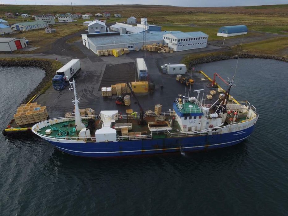 Þórsnes SH á Raufarhöfn í október árið 2018, þrír trukkar frá BB bíða á bryggjunni,