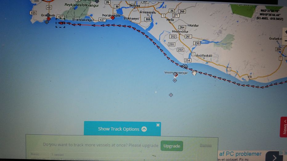 Eins og sést á trakkinur þá hafa Gísli V Jónsson skipstjóri og Hákon Valson stýrimaður svo til sleikt ströndina á leiðinni til heimahafnar. Nokkuð góður skriður hefur verið á Páli Jónssyni GK þar sem að báturinn hefur verið að sigla þetta á um 11 mílum enda með vindinn í bakinn. engu að síður er þarna haugasjór.